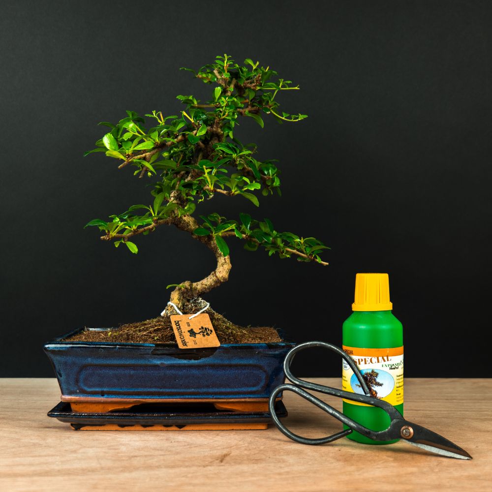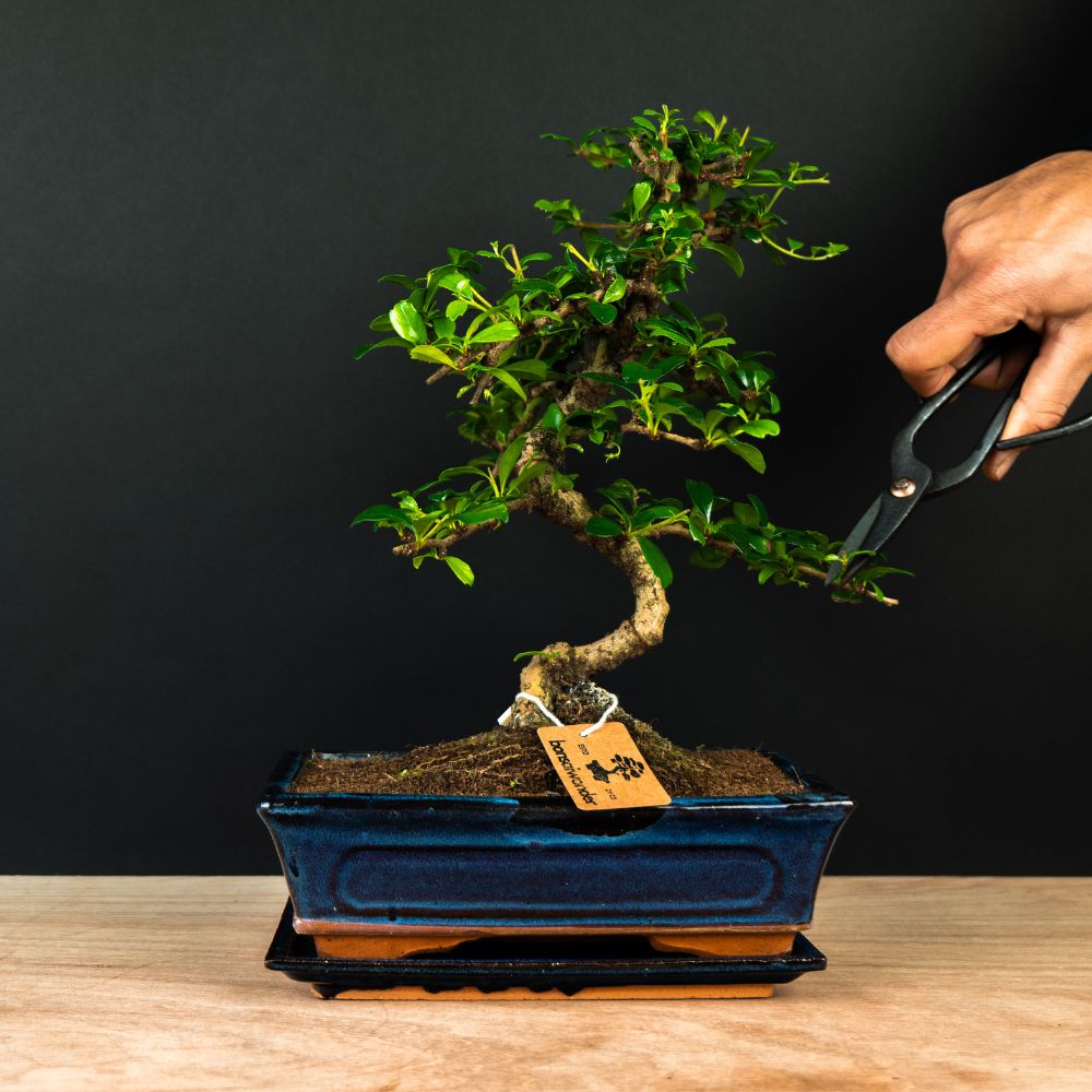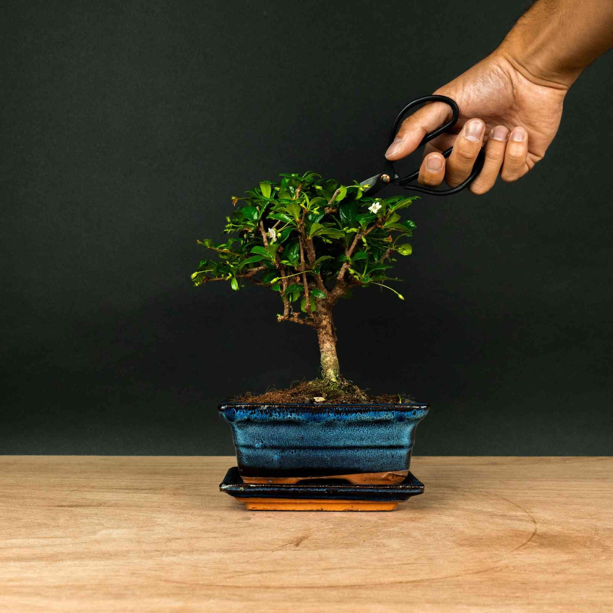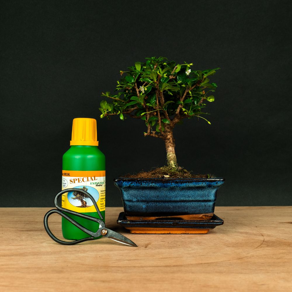 - Beskärning: Använd de medföljande verktygen för att behålla bonsaiens form.